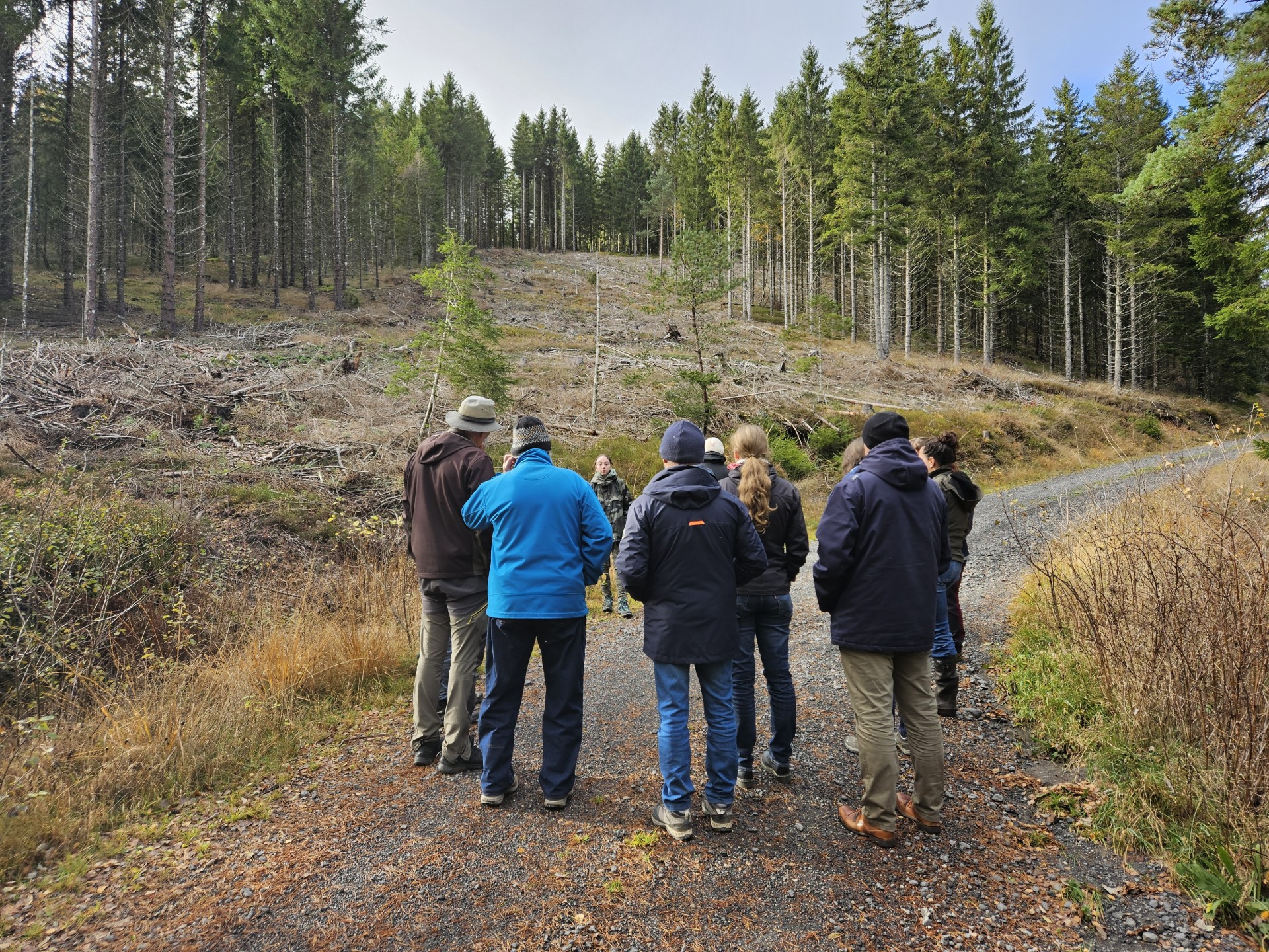 Le vendredi 07 novembre 2025, les Communes forestières Cantal, en partenariat avec l’ONF et le PNR de l’Aubrac, ont mis en place une formation consacrée à l’interdépendance Eau/forêt à Chaudes-Aigues. Cette formation, soutenue par la région AuRA, a réuni 12 participants. Nous avons ainsi pu réaliser une première partie en salle, afin d’évoquer la relation entre l’eau et la forêt, avec un zoom sur l’impact du changement climatique sur l’écosystème forestier. Une seconde partie a été consacrée à une visite de terrain sur la commune de Deux-Verges, pour échanger autour de l’adaptation des forêts au changement climatique, sur une parcelle ayant subi l’attaque des scolytes. Un temps a été consacré à la diversification des essences et à l’importance des zones humides sur le territoire. Un programme et des échanges riches qui ont permis au participant de voir l’importance d’adapter les forêts, de les diversifier et de prendre soin de la ressource en eau.